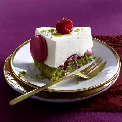 Cut the macarons in half, scrape off the cream. Remove the cake from the tin, press the macaron halves to the edge, arrange on a plate, sprinkle with the remaining pistachios and decorate with raspberries