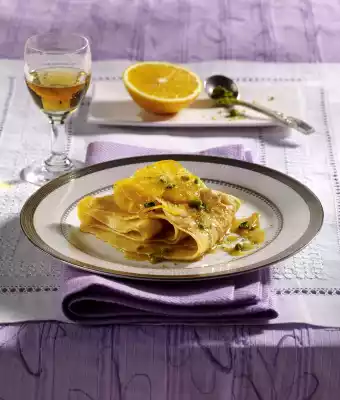 Melt 3 tablespoons of sugar in the pan. Add butter. Stir in orange juice, zest and liqueur. Steam orange slices for about 2 minutes. Fold crêpes together and arrange on plates with oranges and sauce.