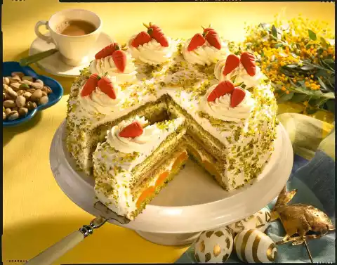 Spread the rest of the whipped cream on top and cover with the last cake base. Put the cake in a cool place for about 1 hour. Whip 500 g cream and remaining vanilla sugar until stiff. Remove the cake from the cake ring and spread 3/4 of the cream all around. Put the rest of the cream into a piping bag with a large star-shaped spout. Sprinkle cake with chopped pistachios and decorate with 8 thick cream tuffs. Place 2 small carrots on each tuff. Results in about 16 pieces