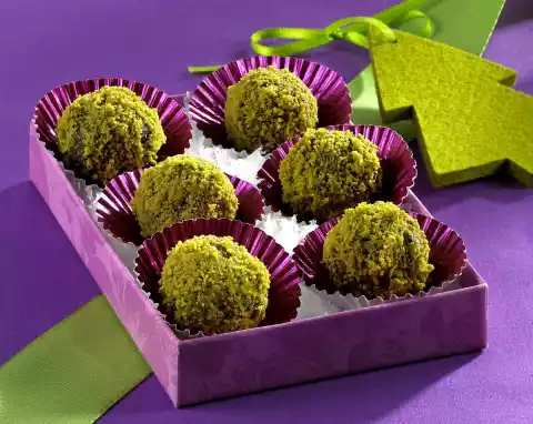 Cut the cherries, plums and figs into small pieces and soak in rum. Roast the hazelnuts on a baking tray in a preheated oven (electric cooker: 200 °C/ circulating air: 175 °C/ gas: level 3) for approx. 5 minutes and let them cool down. Roughly dice the nougat and melt it on a hot water bath. Knead the nougat and marzipan with the remaining ingredients to an even mass. Form small balls and roll in ground pistachios. Place in praline moulds
