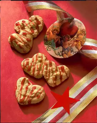 Spray small hearts onto a baking tray lined with baking paper. Bake in the preheated oven (electric oven: 150 °C/ gas: level 1) for approx. 15 minutes, allow to cool. Melt the jelly at low heat, let it cool down.