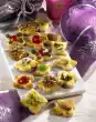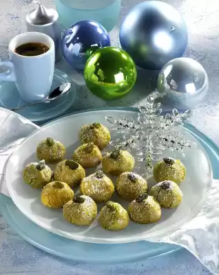 Mix with the whisks of the hand mixer to a smooth and supple mixture. Form approx. 50 balls from the mixture with wet hands. (Caution! The mixture sticks a little bit!) Place on two baking trays lined with baking paper. Carefully brush with egg yolk and place one of the remaining pistachios on each ball. Bake one after the other in a preheated oven (electric oven: 125 °C) for 25-30 minutes. Remove from the oven, place on a rack and allow to cool. Dust thinly with icing sugar as desired