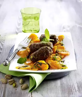 Remove the pistachios from their shells and chop them coarsely. Peel and chop the onion. Peel garlic and press to mince. Knead with onion, pistachios, egg, squeezed toast, salt, pepper and cumin. With moistened hands form 12 minced rolls.