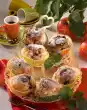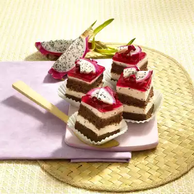 Chill the mixture for 15-20 minutes. In the meantime, cut the chocolate base in half crosswise and enclose 1 base with a baking frame. As soon as the mixture begins to gel, pour half of the mixture onto the base and smooth it down. Place the second cake base on top. Spread the rest of the mixture on the top cake base and smooth it down. Chill for about 2 hours. After 1 1/2 hours soak the red gelatine. Heat up grenadine syrup and 400 ml water. Squeeze out the gelatine and dissolve in it. Allow the juice to cool to room temperature and pour it onto the cream by the spoonful. Chill again for 1 hour. Cut the cake into about 12 cubes and decorate with the remaining pitahaya and pomegranate seeds