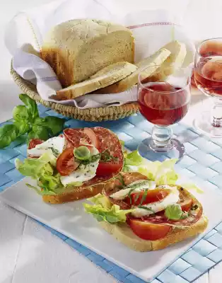 Pour 160 ml water, milk, 30 g room-warm butter, salt, 3-4 tablespoons pizza spice and sugar into the baking tin. Add flour and finally sprinkle yeast. Set program for white bread with medium browning (for Severin program no. 2) and press Start. Remove bread from the baking pan and let it cool on a grid. Drain mozzarella and cut into slices. Wash the tomatoes and cut into slices.