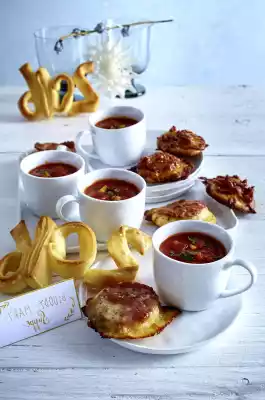 Unroll the pizza dough. Cut the dough sheets into 8 rectangles (approx. 9 x 12 cm) each. Cut each rectangle into 4 longish strips. Place 4 strips together to form the number 2016, pressing them lightly together.