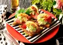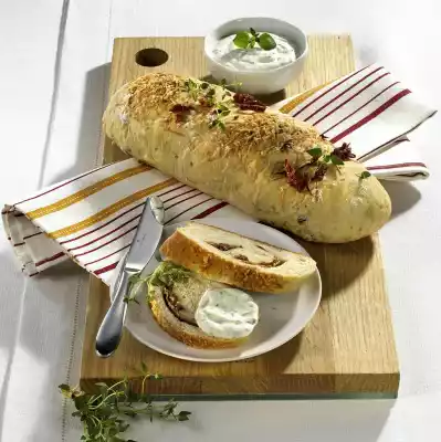 Fold in the dough ends. Dust the ciabatta with flour and cover with the remaining ingredients. Bake in the preheated oven (electric cooker: 200 °C/ convection oven: 175 °C/ gas: level 3) for 30 minutes. Cover after 15 minutes if necessary. Remove the ciabatta from the oven and let it cool down on a cake rack. Garnish with thyme and oregano. Serve with herb quark