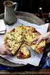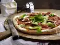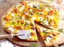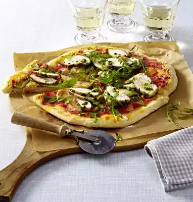 Wash the rocket and drain well. Remove pizza from the oven. Cut the chicken into thin slices. Spread the rocket and chicken slices on the pizza and sprinkle with some pesto