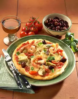 Spread the tomatoes, artichokes, shrimps and olives on the pizzas. Drain the mozzarella and cut into slices. Cover pizzas with it. Season with salt and pepper and gratinate for another 15 minutes. Sprinkle with basil leaves