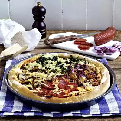 Knead dough, cut in half. Roll out half on a greased pizza tray (approx. 30 cm Ø). Spread half the sauce on top. Cover each pizza quarter with half spinach, half tuna and half red onion, half mushrooms or salami.