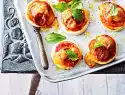 For the sauce boil up the tomatoes. Season with salt, pepper, paprika and sugar and simmer open for about 5 minutes. Let cool off. For the spinach topping peel and chop 1 onion. Fry in 1 tbsp. hot oil.