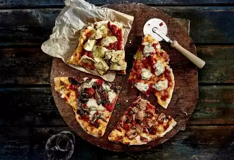 Cover a pizza with artichokes, mozzarella and sprinkle with pepper. 2. cover a pizza with tuna, capers and mozzarella. 3. cover pizza with gorgonzola. 4. cover pizza with olives, anchovies and mozzarella.