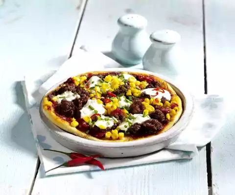 Put corn and ground beef on the pizza. Put the sour cream in a blob. Bake in the preheated oven (electric cooker: 200 °C/ convection oven: 175 °C/ gas: level 3) for 15-20 minutes. Sprinkle with chive rolls and chilli rings.