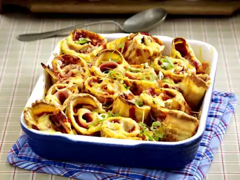 Spread 3 tablespoons of tomato sauce on each pancake. Cover 2 pancakes with ham and 2 pancakes with salami. Spread mozzarella on top. Roll up the pancakes and cut into small rolls. Grease a casserole dish. Spread the rest of the tomato sauce in the dish. Put the pancake rolls in the dish. Sprinkle with pizza cheese and bake in the preheated oven (electric cooker: 200 °C/ convection oven: 175 °C/ gas: level 3) for approx. 25 minutes. Sprinkle with green spring onion rings