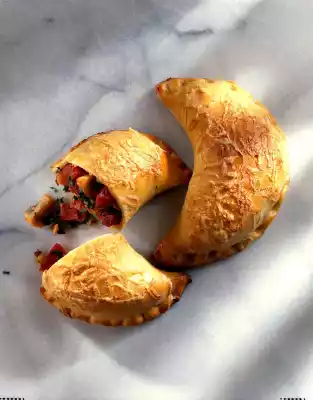 Stir in tomato paste and herbs. Season with salt and pepper and let cool down. Grate cheese finely. Add 2/3 of the cheese, tomatoes and salami to the mushrooms. Place the dough sheets on top of each other and roll out thinly on a floured work surface. Cut out 8 circles (approx. 14 cm Ø). Spread the pizza filling on one half of the circles, fold the other half over. Press the edge of the pizza pocket together with a spoon handle. Mix egg yolk and milk and spread the pockets with it.