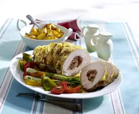 Season with salt and pepper. Spread the stuffing evenly over the roast and pin the cut opening with wooden skewers and tie up with kitchen string. Place roast in the greased fat pan of the oven.