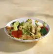 Season again with salt and pepper. Bake in the preheated oven (electric cooker: 200 °C/ convection oven: 175 °C/ gas: level 3) for 5-8 minutes. In the meantime, cut the potatoes in half and fry them crisply in 2 tablespoons of hot oil. Season with salt and pepper. Fry the onion slices in 1 tablespoon of oil. Let spinach collapse on top, season. Serve pizza-poultry steaks, potatoes and spinach garnished with fresh herbs and lime