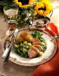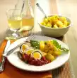 Wash the potatoes and cook in boiling water for 15-20 minutes. Then rinse with cold water, peel and leave to rest. Peel onion, cut into fine slices. Clean and wash the spinach. Wash turkey, dab dry, tap flatter.