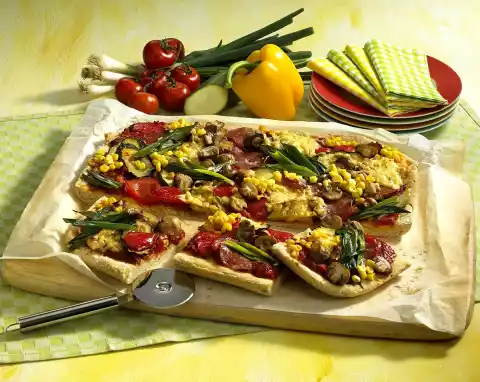 Sauté spring onions briefly in the hot frying fat until translucent. Knead the dough again and roll out to a rectangle (32 x 39 cm). Put the dough on a greased and floured frying pan and spread the tomato mixture evenly. Spread mushrooms, peppers, zucchini, corn and salami evenly on top. Spread the cheese on top. Bake in the preheated oven (electric cooker: 200 °C/ convection oven: 175 °C/ gas: level 3) for 30-35 minutes. 10 minutes before the end of the baking time, spread spring onions on the pizza. Remove the pizza from the oven, cut into 12 pieces and serve immediately