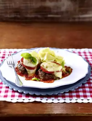 Drain the mozzarella and cut into 8 slices. Wash and clean the tomatoes and also cut them into 8 slices. Cover the meatballs with tomatoes and mozzarella and bake under the hot grill of the oven for 5-10 minutes