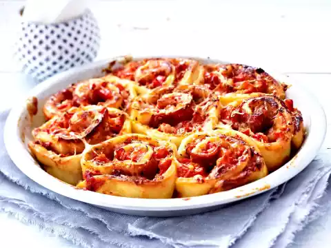 Spread the dough with tomato sauce. Spread ham and salami on top. Then roll individual pieces into a roulade. Put it in the oven and bake for about 10 minutes at 180 degrees.