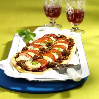 Roll out the dough oval (20 x 30 cm) on a floured work surface and place on a baking tray lined with baking paper. Spread with the tomato sauce. Cover with tomato and mozzarella slices and season with salt and pepper. Spread the mince around the slices. Bake the pizza in a preheated oven (electric cooker: 200 °C/ convection oven: 175 °C/ gas: level 3) for about 15 minutes. Remove the pizza and garnish with basil and marjoram
