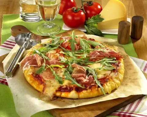 Halve the dough and roll out each one round (28 cm Ø) on a floured work surface. Spread with the tomato sauce and cover with tomato and mozzarella slices. Sprinkle with Goudaraspel. Place the pizzas one after the other on a baking tray lined with baking paper. Bake in the preheated oven (electric cooker: 200 °C/ convection oven: 175 °C/ gas: level 3) for about 15 minutes. In the meantime, clean, wash and dry the rocket. Cover the finished pizza with slices of ham and rocket and serve