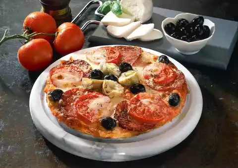 Knead flour, yeast, salt, oil and about 150 ml of lukewarm water. Form 4 pizza bases, let them rise for 20 minutes. In the meantime, slice the tomatoes and remove the stalk. Cut artichoke hearts in half.