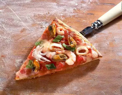 Knead again, cut in half and roll out on a floured work surface to two round bases (approx. 20 cm Ø). Place on a baking tray lined with baking paper, spread with chunky tomatoes and pre-bake in a preheated oven (electric cooker: 200 °C/ gas: level 3) for approx. 15 minutes. Clean, wash and chop the spring onions. Drain the seafood and spread on the pizzas with the spring onions. Season with salt and pepper, sprinkle with cheese and bake for another 10 minutes