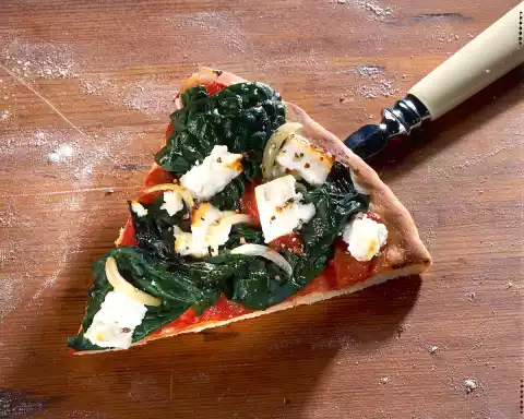 In the meantime, sort and wash the spinach. Peel and finely dice the onion and garlic. Sauté in the remaining hot oil. Add the spinach, sauté and let it collapse. Season with salt and pepper. Cut cheese into cubes. Spread spinach and cheese on the pizza and bake for another 10-15 minutes