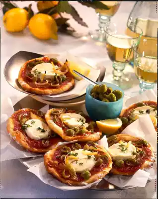 Spread on 2 baking trays lined with baking paper and brush with the tomato sauce. Sprinkle with onion strips and olives. Cover with cheese halves and sprinkle with 1/2 tsp honey on each