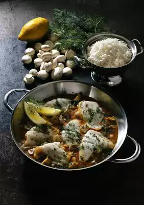 Cover and cook over a low heat for about 8 minutes. Wash and chop the dill and sprinkle over the top. Garnish with lemon wedges.