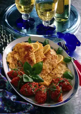 Wash the plaice fillets, dab dry, sprinkle with lemon juice and leave covered for about 10 minutes. Coarsely chop peeled tomatoes with a knife in the tin. Peel onions, dice finely and fry in 2 tablespoons of hot oil.