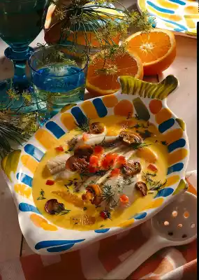Simmer for a few minutes and thicken with sauce thickener. Season with salt, pepper and some lemon juice. Let the orange fillets simmer in the hot sauce. Wash and halve the tomatoes, remove the seeds and finely dice the flesh. Clean and slice the mushrooms. Dill wash, dab dry, pluck from the stalks (put the stalks aside). Cut dill flags finely. Wash and drain the plaice fillets, cut them in half lengthwise. For the stock, simmer 1/2 litre water, white wine, remaining lemon juice, dill stalks, salt, mustard and peppercorns and peeled, halved shallot for a few minutes. Let the fillets simmer at low heat for about 5 minutes. Fry the mushrooms in hot fat until golden brown. Season with salt and pepper.