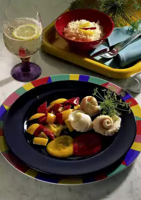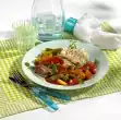 Puree 1/3 each of the red and yellow pepper pieces and pass through a sieve. Season to taste with salt, pepper and paprika. Arrange the plaice rolls with the paprika vegetables and the paprika sauces on a plate.