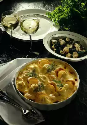 Do not let it boil anymore. Season with salt, pepper and lemon juice. Pour the sauce over the rolls and bake in a preheated oven (electric cooker: 225 ° C/ gas: level 4) until golden brown. Garnish with puff pastry fleurons and dill.