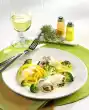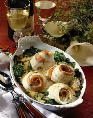 Then sprinkle it thickly with dill. Halve the salmon slices, place them on the fillets and roll them up. Fix with wooden skewers and distribute the rolls into the moulds. Pour sauce over them and bake in a preheated oven (electric cooker: 200°C/ gas: level 3) for about 25 minutes.