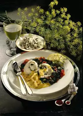Scald the tomatoes, rinse with cold water and peel the skin. Cut tomatoes into quarters, remove seeds and dice. Peel and chop the onions. Wash and clean the spinach. Heat 30 g fat, sweat flour in it and deglaze with wine and cream. Add saffron and simmer for 10 minutes. Add crabs and 6 tablespoons of fish stock and season with salt and pepper. In the meantime heat the remaining fat, sauté the onion cubes in it, add the spinach and let it collapse. Add tomato cubes and season with salt, pepper and nutmeg.
