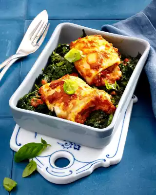 Wash the fish, dab dry, cut in half lengthwise and season with salt and pepper. Spread fish with pesto and spread tomatoes on top. Roll up the fillets and place them on the spinach. Cook the casserole in a preheated oven (electric cooker: 175 °C/ convection oven: 150 °C/ gas: see manufacturer) for approx. 10 minutes. Wash the basil, shake dry and remove the leaves. Remove the casserole from the oven and sprinkle with basil.