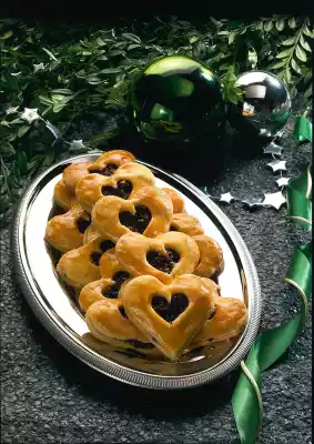 Cut out hearts (4 cm Ø). Spread half of them thinly with the jam. Cut out the middle of the remaining biscuits with a small heart shape (2 cm Ø). Place on the coated biscuits.