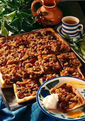 Bake in the preheated oven (electric oven: 200 °C/ gas: level 3) for 30-35 minutes. Melt the redcurrant jelly and spread on the plums. Results in about 16 pieces.