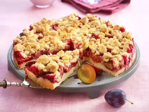 First knead into crumbles with the dough hooks of the hand mixer, then with your hands. Grease a springform pan (26 cm Ø). Put approx. 2/3 of the crumbles into the form, press to a flat bottom. Spread the plums on the bottom, add the remaining crumbles.