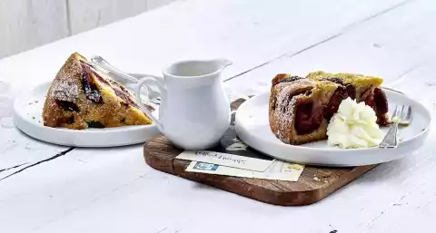 For the cream mixture, stir cream, sauce powder and 50 g sugar until smooth. Stir in 2 eggs. Pour the glaze evenly over the plums. Bake in a hot oven for about 45 minutes.