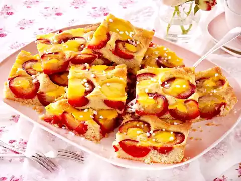 Grease a fat pan of the oven (approx. 34 x 41 cm) and dust with flour. Spread the dough evenly in the fat pan. Spread the plums with the cut surface facing upwards and sprinkle with 1-2 tbsp. sugar. Bake in the preheated oven, middle shelf (electric oven: 175 °C/ convection oven: 150 °C/ gas: see manufacturer) for approx. 40 minutes