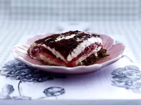 Spread half of the cream evenly on the cantuccini. Spread plum compote on top. Spread the rest of the cream on top and chill for at least 1 1/2 hours. Dust with cocoa shortly before serving.