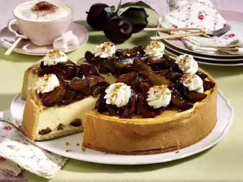 Add the rest of the cheese mixture. Bake in the preheated oven (electric range: 175 °C/ convection oven: 150 °C/ gas: level 2) for 60-65 minutes on the bottom shelf. Then leave to rest for 10 minutes with the oven door open. Place the cake on a cake rack, remove from the edge of the mould with a knife and allow to cool in the mould. Cut the remaining plums in half again and cover the cooled cake with them. Mix the cake glaze, 1 tablespoon sugar and apple juice and heat while stirring. Bring the icing to the boil briefly, then immediately spread it over the plums from the middle. Refrigerate the cake for another 30 minutes until the icing is firm