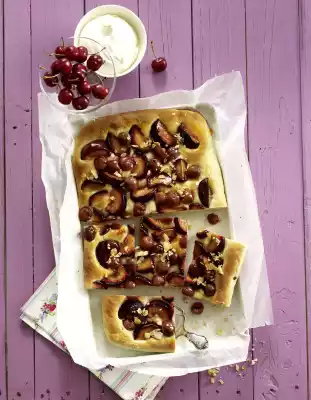 Warm milk lukewarm and crumble yeast into it. Put flour, 75 g sugar, butter, egg and 1 pinch of salt in a bowl. Add the milk-yeast mixture bit by bit and quickly work into a smooth dough using the dough hook of the hand mixer. Cover and leave to rise for approx. 45 minutes in a warm place. Wash the cherries, remove the stalks and pit them. Cut plums in half, stone them and cut them into slices.