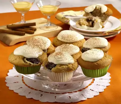 Place 1 paper sleeve in each of the recesses of a muffin tin (12 recesses). Spread the dough evenly with a tablespoon. Bake in the preheated oven (electric cooker: 175 °C/ convection oven: 150 °C/ gas: level 2) for 35-40 minutes. Remove the muffins from the oven and let them cool down on a grid. Whip the cream and egg liqueur until half stiff, while pouring in 1 sachet of vanilla sugar. Place a cream topping on each muffin and dust with 1 teaspoon of cinnamon