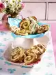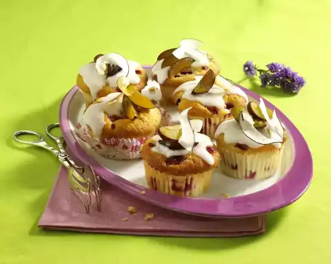 Lightly roast coconut chips in the oven for 3-5 minutes without taking colour. Wash 3 plums, remove stones and cut into slices. Sieve the icing sugar into a bowl. Add 1 tablespoon of lemon juice and mix to a thick glaze (add some more lemon juice if necessary). Put a blob of icing on each muffin and decorate with plum wedges and coconut chips. Let the icing dry for about 30 minutes
