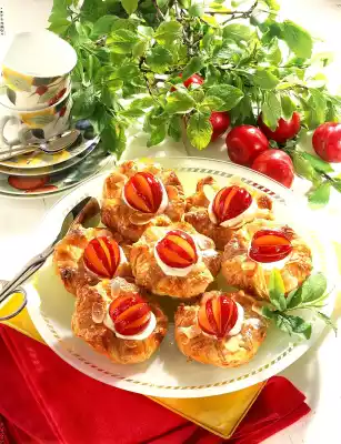 Remove the ramekins. Let the dough pieces cool down. Whip cream cheese, lemon peel, cream and sugar until stiff. Put cream in the middle of the dough pieces. Wash, halve and stone the plums. Halve the fruit halves again.